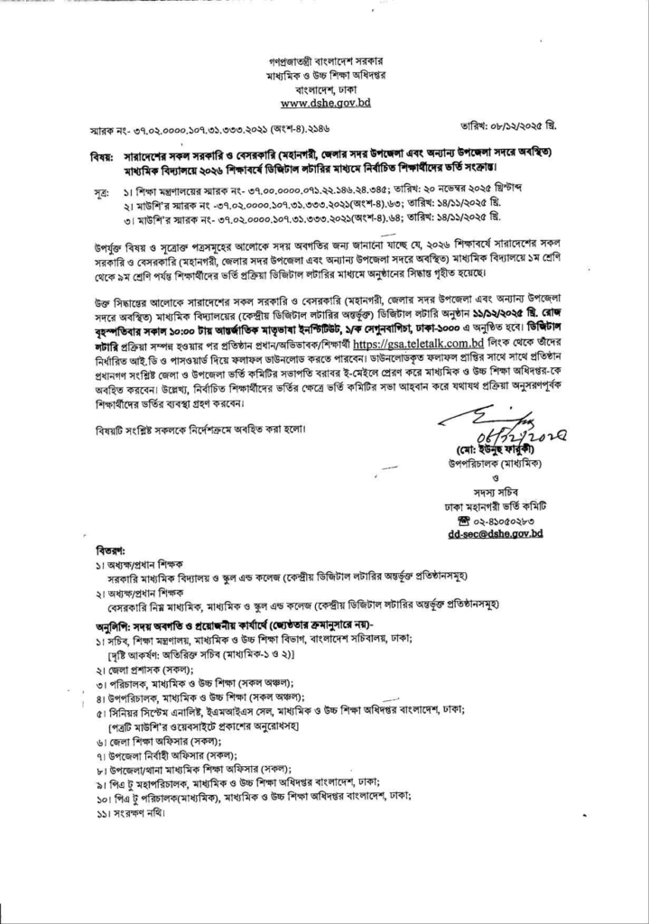 সকল সরকারি বিদ্যালয়ে ভর্তির লটারির সময়সূচী